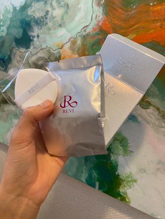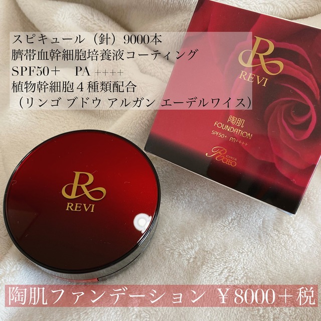 「REVI陶肌ファンデーション ジュエル」 内容量:15g 通常色21番 ルヴィ陶肌ファンデーションからついに新作が誕生いたしました! もうこれ以外使えない!というお声も多い陶肌ファンデーションですが、 さらに輝くツヤ肌を叶える為に新しく優秀な成分を追加しました! ①(フィルムエクセル®) 天然植物由来のバイオポリマーシートで皮膚の保護・シワ改善 ②植物由来エクソソーム ・ローズマリー葉エキスエクソソーム ・ツボクサ葉エキスエクソソーム ・ティーツリー葉エキスエクソソーム 保湿力を高め、余分な皮脂を抑制し、コラーゲン産生促進による抗シワ作用 ③フラーレン ビタミンCの250倍の強力な抗酸化力とUV耐性 ④3種のパウダーコンプレックス ・ダイヤモンドパウダー(肌を輝かせる) ・マイカ(肌への密着力を高める) ・シリカ(シルキーで高級感のあるテクスチャー) それぞれ異なる形と特性を持つパウダーにより、 フィルターを通したようなソフトフォーカシング効果 ⑤美容液コーティングされた3種のスピキュール ・ヒアルロン酸(保湿力UP) ・トコフェロール(弾力UP) ・α-ビサボロール(抗炎症、美白) 従来のヒト臍帯血細胞培養上清液コーティングのスピキュールにこの3種を加えることで、 さらにリフトアップ力、ハリ感、ツヤ感をアップさせ、 ニキビ、角質の新陳代謝UP、小じわ、くすみ、シミにも働きかける 優秀なファンデーションに仕上がりました! また、ダイヤモンドパウダーの量も他製品より多く配合しております(※当社